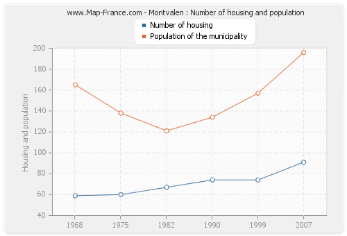 The population of Montvalen was 196 inhabitants in 2007, 157 inhabitants in 1999, 134 inhabitants in 1990, 121 inhabitants in 1982, 138 inhabitants in 1975 and 165 inhabitants in 1968. Meanwhile, the number of housing of Montvalen was 91 in 2007, 74 in 1999, 74 in 1990, 67 in 1982, 60 in 1975 and 59 in 1968.