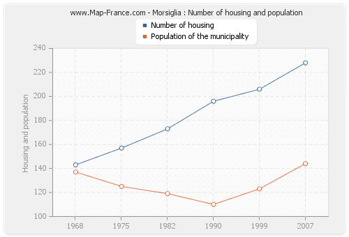 The population of Morsiglia was 144 inhabitants in 2007, 123 inhabitants in 1999, 110 inhabitants in 1990, 119 inhabitants in 1982, 125 inhabitants in 1975 and 137 inhabitants in 1968. Meanwhile, the number of housing of Morsiglia was 228 in 2007, 206 in 1999, 196 in 1990, 173 in 1982, 157 in 1975 and 143 in 1968.