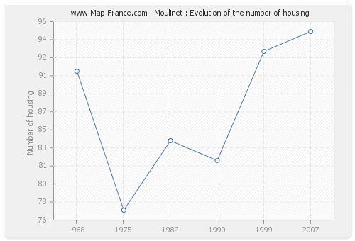 The number of housing of Moulinet was 95 in 2007, 93 in 1999, 82 in 1990, 84 in 1982, 77 in 1975 and 91 in 1968.