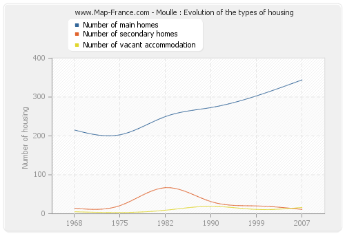 The number of housing of Moulle was 371 in 2007, 334 in 1999, 323 in 1990, 326 in 1982, 227 in 1975 and 234 in 1968.