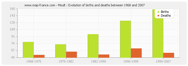 Population of Moult was 1 687 inhabitants in 2007, 1 128 inhabitants in 1999, 919 inhabitants in 1990, 827 inhabitants in 1982, 765 inhabitants in 1975 and 670 inhabitants in 1968.