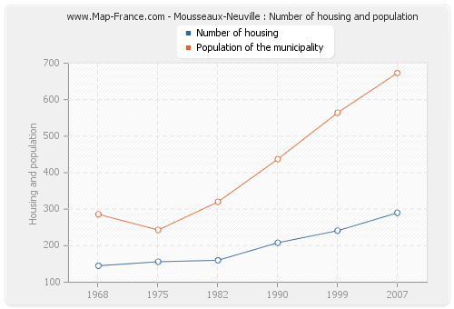 The population of Mousseaux-Neuville was 673 inhabitants in 2007, 564 inhabitants in 1999, 437 inhabitants in 1990, 320 inhabitants in 1982, 243 inhabitants in 1975 and 286 inhabitants in 1968. Meanwhile, the number of housing of Mousseaux-Neuville was 290 in 2007, 241 in 1999, 208 in 1990, 160 in 1982, 156 in 1975 and 145 in 1968.
