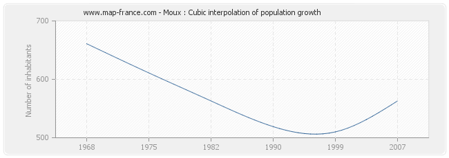 This curve shows the history of the population of Moux from 1968 to 2007 in cubic interpolation. This provides more precisely the population of the municipality of Moux the years where no census has been taken.