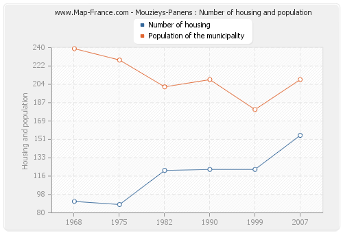 The population of Mouzieys-Panens was 209 inhabitants in 2007, 180 inhabitants in 1999, 209 inhabitants in 1990, 202 inhabitants in 1982, 228 inhabitants in 1975 and 239 inhabitants in 1968. Meanwhile, the number of housing of Mouzieys-Panens was 155 in 2007, 122 in 1999, 122 in 1990, 121 in 1982, 88 in 1975 and 91 in 1968.