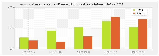 This curve shows the history of the population of Mozac from 1968 to 2007 in cubic interpolation. This provides more precisely the population of the municipality of Mozac the years where no census has been taken.