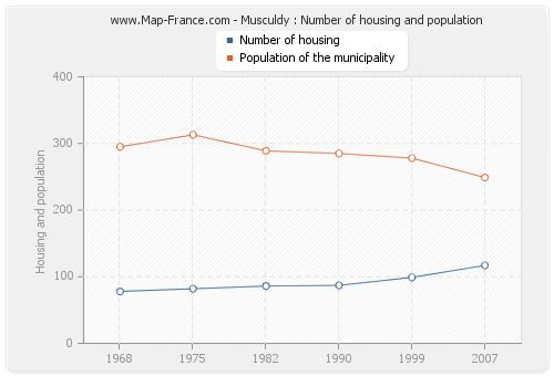 The population of Musculdy was 249 inhabitants in 2007, 278 inhabitants in 1999, 285 inhabitants in 1990, 289 inhabitants in 1982, 313 inhabitants in 1975 and 295 inhabitants in 1968. Meanwhile, the number of housing of Musculdy was 117 in 2007, 99 in 1999, 87 in 1990, 86 in 1982, 82 in 1975 and 78 in 1968.