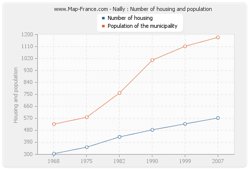 The population of Nailly was 1 179 inhabitants in 2007, 1 112 inhabitants in 1999, 1 008 inhabitants in 1990, 761 inhabitants in 1982, 579 inhabitants in 1975 and 527 inhabitants in 1968. Meanwhile, the number of housing of Nailly was 573 in 2007, 529 in 1999, 484 in 1990, 431 in 1982, 354 in 1975 and 305 in 1968.