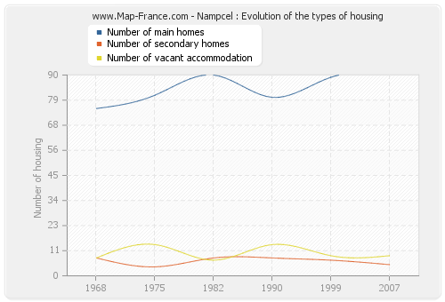 The following graphs show the history of the number and the type of housing of Nampcel from 1968 to 2007. The second graph is drawn in cubic interpolation. This allows to obtain more exactly the number of accommodation of the town of Nampcel years where no inventory was made.