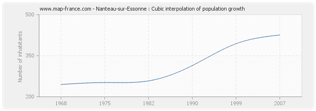 This curve shows the history of the population of Nanteau-sur-Essonne from 1968 to 2007 in cubic interpolation. This provides more precisely the population of the municipality of Nanteau-sur-Essonne the years where no census has been taken.