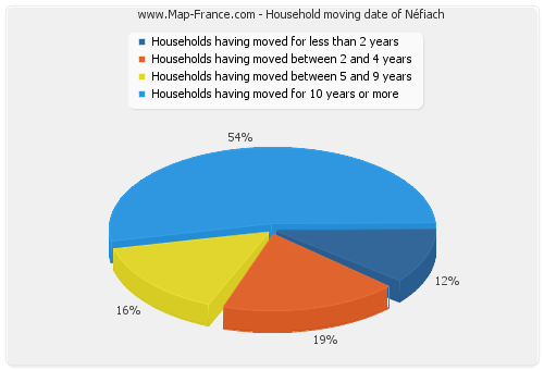 - Number of households of Néfiach having moved between 2 and 5 years : 77 - Number of households of Néfiach having moved between 5 and 9 years : 65 - Number of households of Néfiach having moved for 10 years or more : 225 |