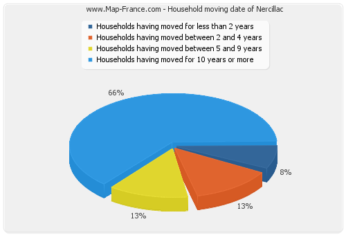 - Number of households of Nercillac having moved between 2 and 5 years : 57 - Number of households of Nercillac having moved between 5 and 9 years : 56 - Number of households of Nercillac having moved for 10 years or more : 280 |