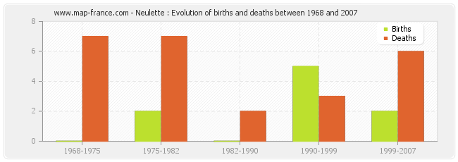 Population of Neulette was 17 inhabitants in 2007, 32 inhabitants in 1999, 24 inhabitants in 1990, 23 inhabitants in 1982, 26 inhabitants in 1975 and 30 inhabitants in 1968.