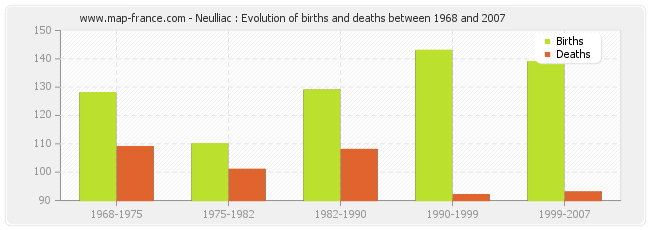 Neulliac : evolution of births and deaths from 1968 to 2007