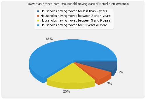 - Number of households of Neuville-en-Avesnois having moved between 2 and 5 years : 8 - Number of households of Neuville-en-Avesnois having moved between 5 and 9 years : 22 - Number of households of Neuville-en-Avesnois having moved for 10 years or more : 73 |