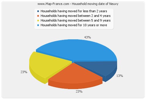 - Number of households of Neuvy having moved between 2 and 5 years : 18 - Number of households of Neuvy having moved between 5 and 9 years : 18 - Number of households of Neuvy having moved for 10 years or more : 34 |