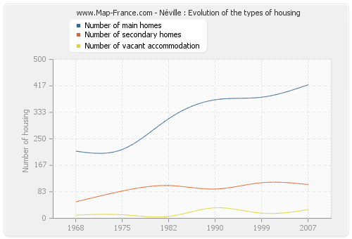The following graphs show the history of the number and the type of housing of Néville from 1968 to 2007. The second graph is drawn in cubic interpolation. This allows to obtain more exactly the number of accommodation of the town of Néville years where no inventory was made.