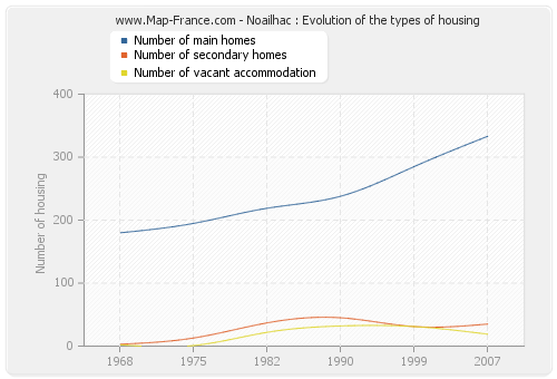 In 2007 the accommodations of Noailhac consisted of 333 main homes, 35 second homes and 19 vacant accommodations.