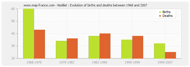 Noëllet : evolution of births and deaths from 1968 to 2007