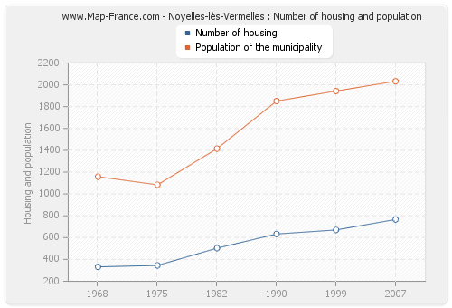 The population of Noyelles-lès-Vermelles was 2 033 inhabitants in 2007, 1 943 inhabitants in 1999, 1 851 inhabitants in 1990, 1 415 inhabitants in 1982, 1 084 inhabitants in 1975 and 1 158 inhabitants in 1968. Meanwhile, the number of housing of Noyelles-lès-Vermelles was 766 in 2007, 670 in 1999, 633 in 1990, 503 in 1982, 345 in 1975 and 332 in 1968.