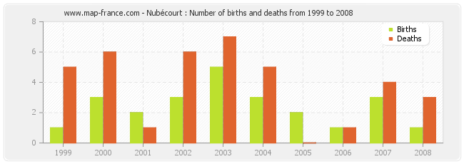 - Nubécourt in 2008 : 1 births and 3 deaths
