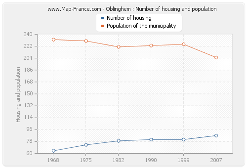 The population of Oblinghem was 205 inhabitants in 2007, 225 inhabitants in 1999, 223 inhabitants in 1990, 221 inhabitants in 1982, 230 inhabitants in 1975 and 232 inhabitants in 1968. Meanwhile, the number of housing of Oblinghem was 87 in 2007, 81 in 1999, 81 in 1990, 79 in 1982, 73 in 1975 and 64 in 1968.
