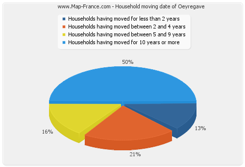- Number of households of Oeyregave having moved between 2 and 5 years : 29 - Number of households of Oeyregave having moved between 5 and 9 years : 21 - Number of households of Oeyregave having moved for 10 years or more : 68 |