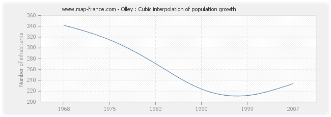 This curve shows the history of the population of Olley from 1968 to 2007 in cubic interpolation. This provides more precisely the population of the municipality of Olley the years where no census has been taken.