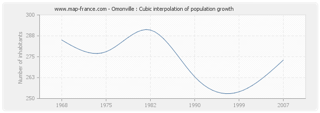 This curve shows the history of the population of Omonville from 1968 to 2007 in cubic interpolation. This provides more precisely the population of the municipality of Omonville the years where no census has been taken.