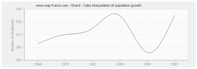 This curve shows the history of the population of Onard from 1968 to 2007 in cubic interpolation. This provides more precisely the population of the municipality of Onard the years where no census has been taken.