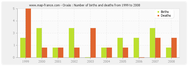 Population of Oraàs was 174 inhabitants in 2007, 170 inhabitants in 1999, 180 inhabitants in 1990, 197 inhabitants in 1982, 212 inhabitants in 1975 and 205 inhabitants in 1968.