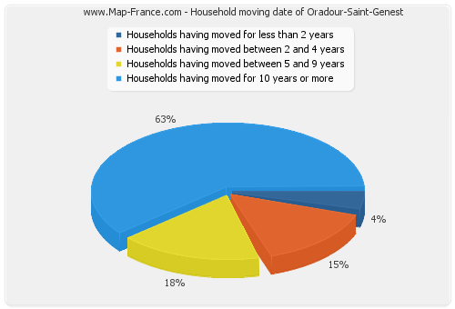 - Number of households of Oradour-Saint-Genest having moved between 2 and 5 years : 27 - Number of households of Oradour-Saint-Genest having moved between 5 and 9 years : 32 - Number of households of Oradour-Saint-Genest having moved for 10 years or more : 113 |