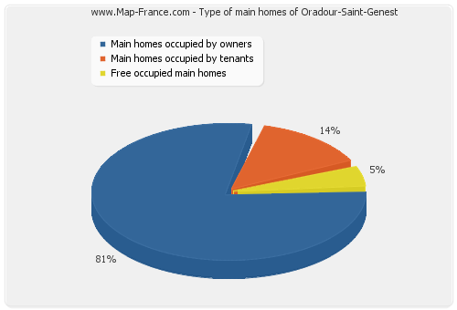 - Number of main homes of Oradour-Saint-Genest occupied by owners : 146 - Number of main homes of Oradour-Saint-Genest occupied by tenants : 25 - Number of main homes of Oradour-Saint-Genest occupied free of charge : 9 |