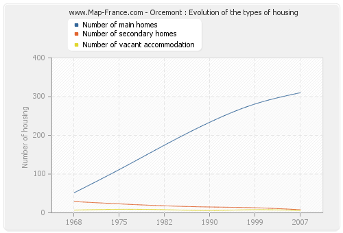 The number of housing of Orcemont was 324 in 2007, 302 in 1999, 255 in 1990, 201 in 1982, 144 in 1975 and 88 in 1968.