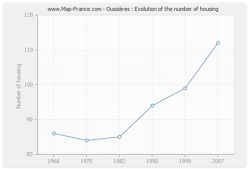 The number of housing of Oussières was 112 in 2007, 99 in 1999, 94 in 1990, 85 in 1982, 84 in 1975 and 86 in 1968.