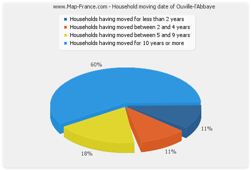 - Number of households of Ouville-l'Abbaye having moved between 2 and 5 years : 22 - Number of households of Ouville-l'Abbaye having moved between 5 and 9 years : 38 - Number of households of Ouville-l'Abbaye having moved for 10 years or more : 126 |
