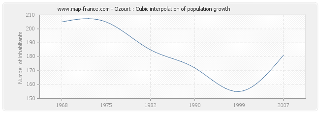 This curve shows the history of the population of Ozourt from 1968 to 2007 in cubic interpolation. This provides more precisely the population of the municipality of Ozourt the years where no census has been taken.