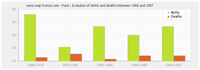Population of Pacé was 377 inhabitants in 2007, 324 inhabitants in 1999, 295 inhabitants in 1990, 252 inhabitants in 1982, 285 inhabitants in 1975 and 306 inhabitants in 1968.