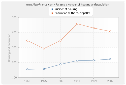The population of Parassy was 407 inhabitants in 2007, 429 inhabitants in 1999, 458 inhabitants in 1990, 346 inhabitants in 1982, 293 inhabitants in 1975 and 346 inhabitants in 1968. Meanwhile, the number of housing of Parassy was 223 in 2007, 215 in 1999, 213 in 1990, 188 in 1982, 158 in 1975 and 155 in 1968.
