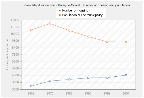 The population of Paray-le-Monial was 9 138 inhabitants in 2007, 9 191 inhabitants in 1999, 9 859 inhabitants in 1990, 10 639 inhabitants in 1982, 11 545 inhabitants in 1975 and 10 716 inhabitants in 1968. Meanwhile, the number of housing of Paray-le-Monial was 4 867 in 2007, 4 528 in 1999, 4 505 in 1990, 4 297 in 1982, 4 094 in 1975 and 3 439 in 1968.