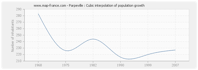 This curve shows the history of the population of Parpeville from 1968 to 2007 in cubic interpolation. This provides more precisely the population of the municipality of Parpeville the years where no census has been taken.