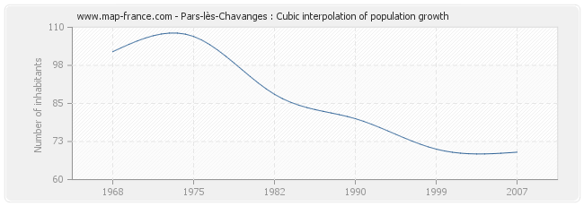 This curve shows the history of the population of Pars-lès-Chavanges from 1968 to 2007 in cubic interpolation. This provides more precisely the population of the municipality of Pars-lès-Chavanges the years where no census has been taken.