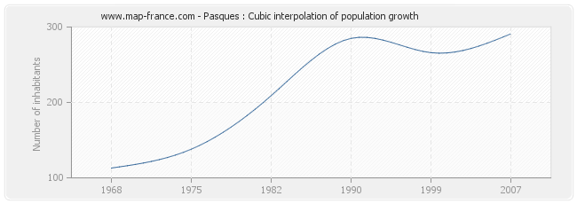 This curve shows the history of the population of Pasques from 1968 to 2007 in cubic interpolation. This provides more precisely the population of the municipality of Pasques the years where no census has been taken.