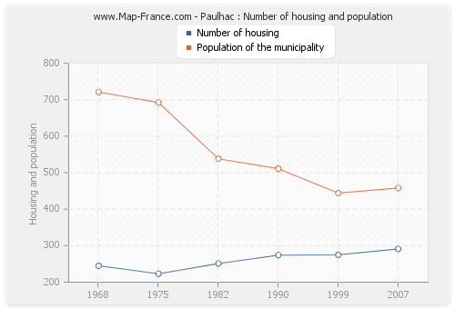 The population of Paulhac was 458 inhabitants in 2007, 444 inhabitants in 1999, 511 inhabitants in 1990, 538 inhabitants in 1982, 692 inhabitants in 1975 and 721 inhabitants in 1968. Meanwhile, the number of housing of Paulhac was 291 in 2007, 275 in 1999, 274 in 1990, 251 in 1982, 223 in 1975 and 245 in 1968.