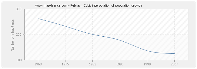 This curve shows the history of the population of Pébrac from 1968 to 2007 in cubic interpolation. This provides more precisely the population of the municipality of Pébrac the years where no census has been taken.