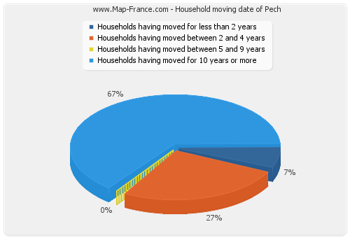 - Number of households of Pech having moved between 2 and 5 years : 4 - Number of households of Pech having moved between 5 and 9 years : 0 - Number of households of Pech having moved for 10 years or more : 10 |