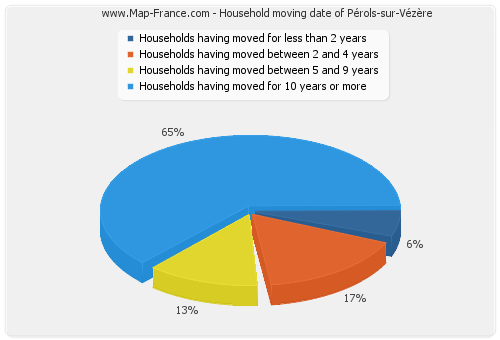 - Number of households of Pérols-sur-Vézère having moved between 2 and 5 years : 17 - Number of households of Pérols-sur-Vézère having moved between 5 and 9 years : 13 - Number of households of Pérols-sur-Vézère having moved for 10 years or more : 66 |
