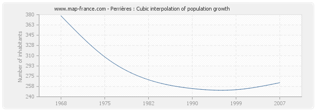 This curve shows the history of the population of Perrières from 1968 to 2007 in cubic interpolation. This provides more precisely the population of the municipality of Perrières the years where no census has been taken.