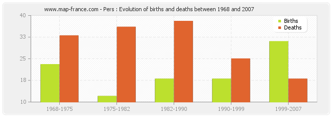 Population of Pers was 295 inhabitants in 2007, 234 inhabitants in 1999, 209 inhabitants in 1990, 244 inhabitants in 1982, 266 inhabitants in 1975 and 327 inhabitants in 1968.
