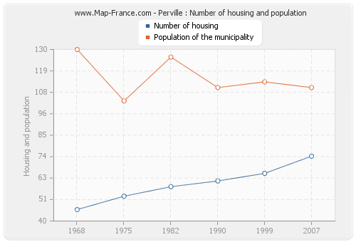 The population of Perville was 110 inhabitants in 2007, 113 inhabitants in 1999, 110 inhabitants in 1990, 126 inhabitants in 1982, 103 inhabitants in 1975 and 130 inhabitants in 1968. Meanwhile, the number of housing of Perville was 74 in 2007, 65 in 1999, 61 in 1990, 58 in 1982, 53 in 1975 and 46 in 1968.