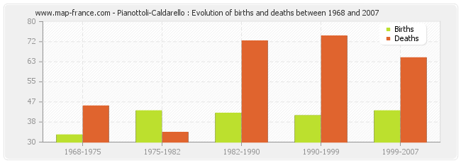 Pianottoli-Caldarello : evolution of births and deaths from 1968 to 2007
